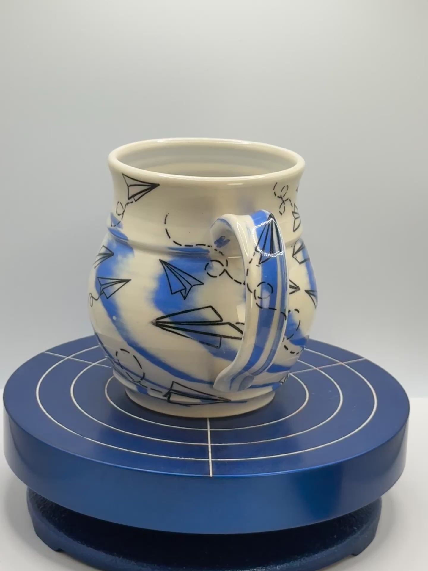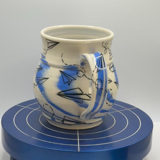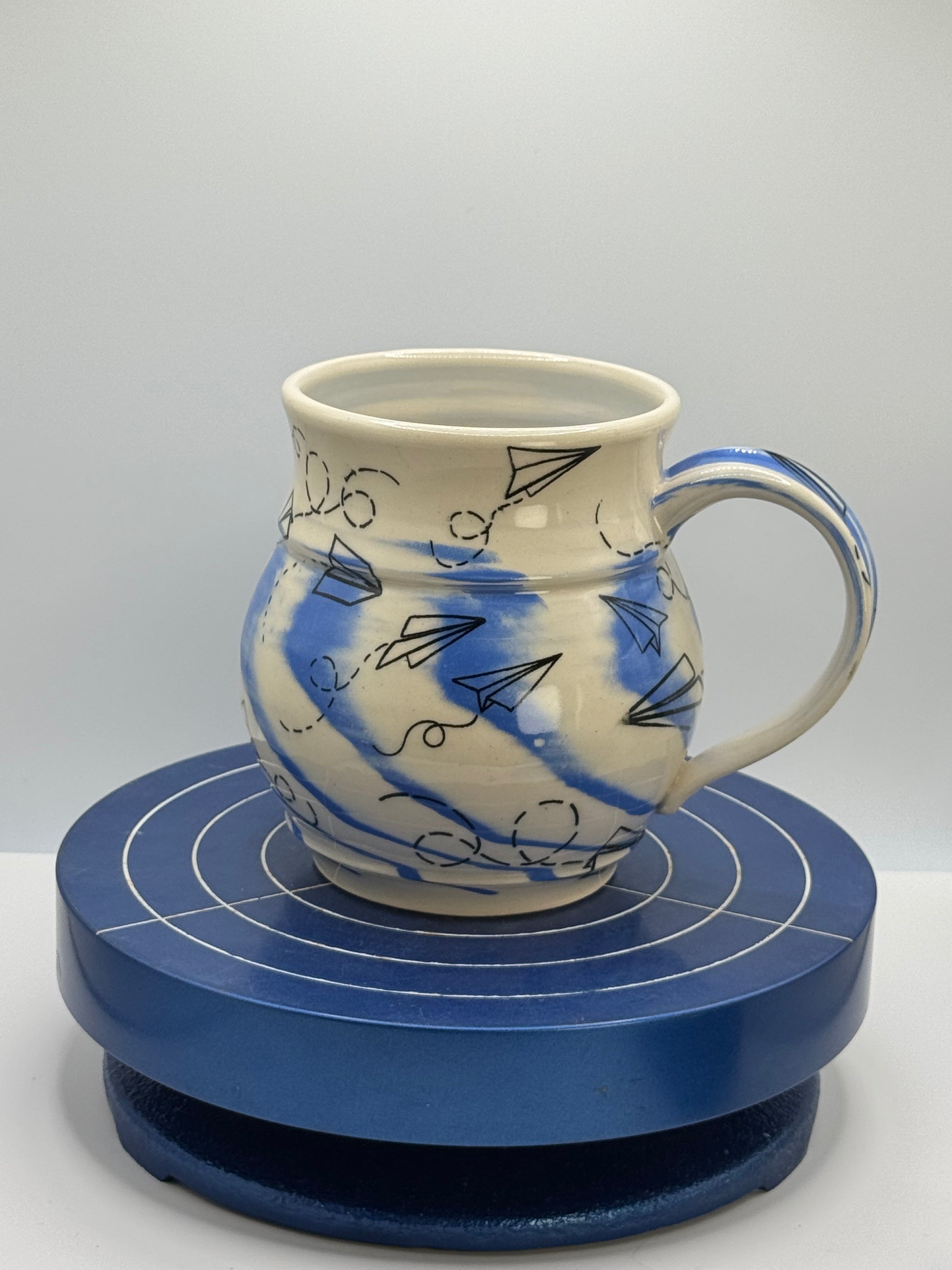 ~12oz handmade ceramic mug. Wheel-thrown stoneware with blue porcelain and graphic paper airplane. Glossy finish. Dishwasher and microwave safe. Made for daily rituals, slow sips, and small moments that stay with you.