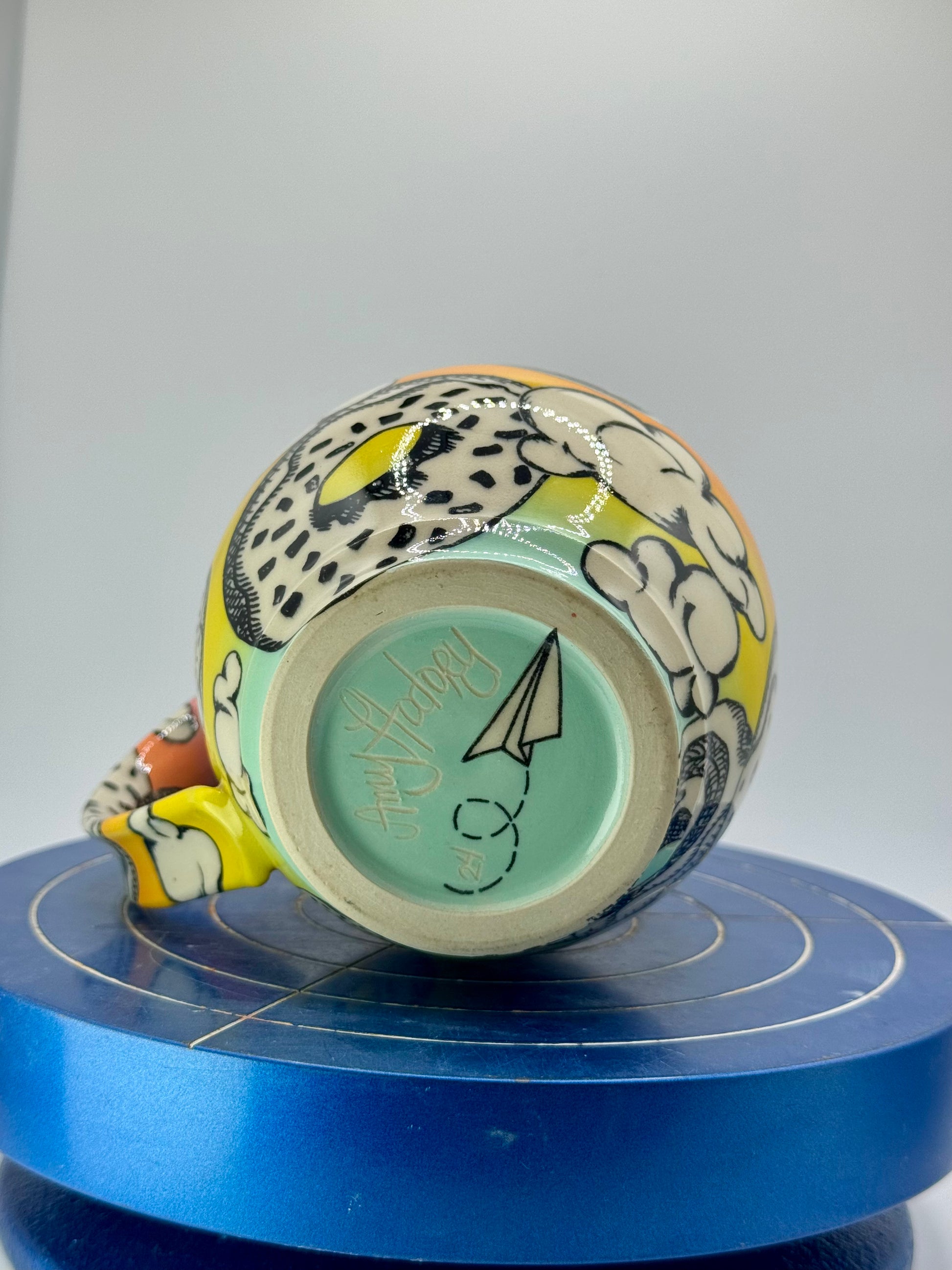 ~12oz handmade ceramic mug. Wheel-thrown stoneware with hand-painted glaze and bold graphic transfers. Glossy finish. Dishwasher and microwave safe. Made for daily rituals, slow sips, and small moments that stay with you.