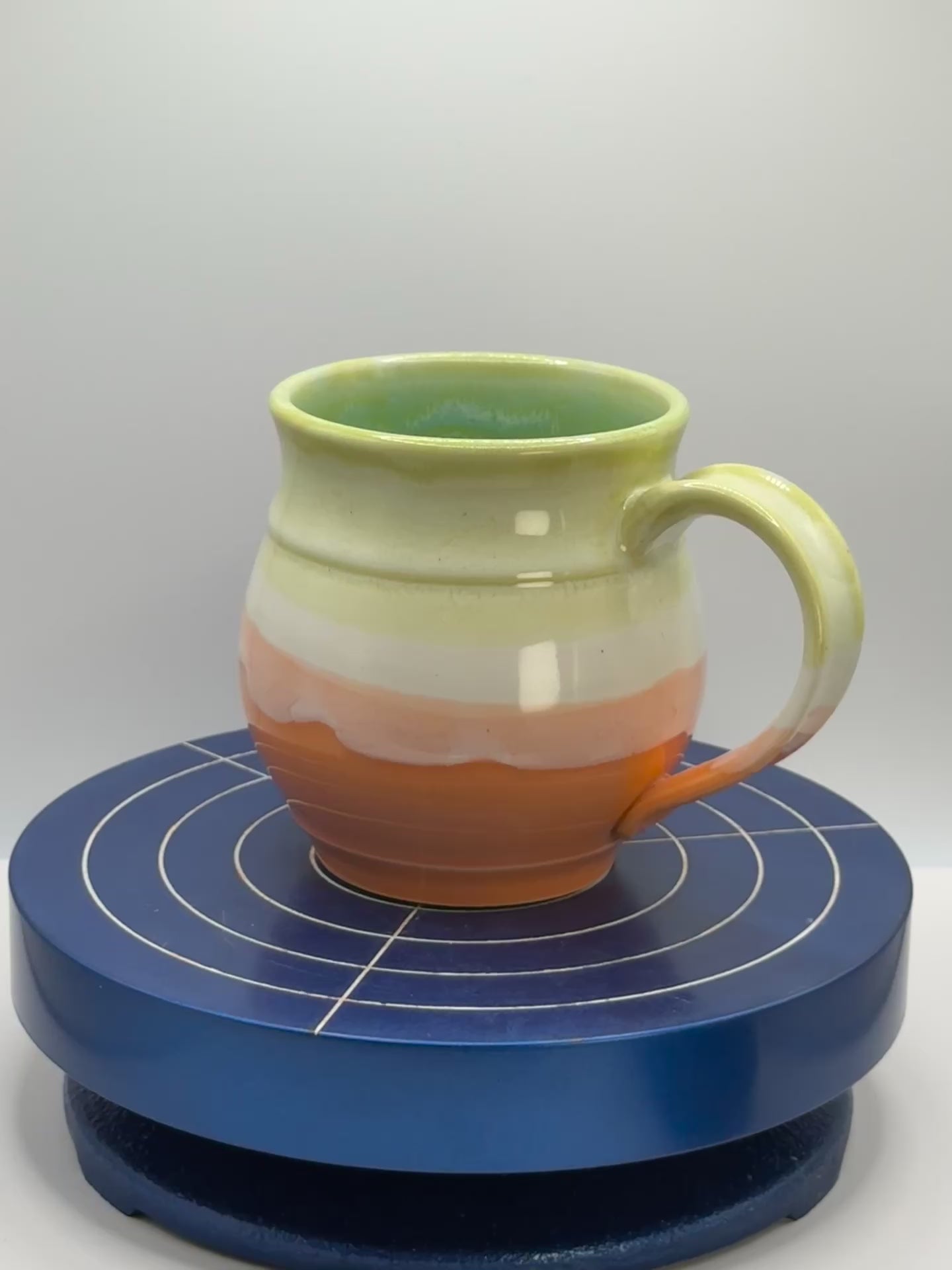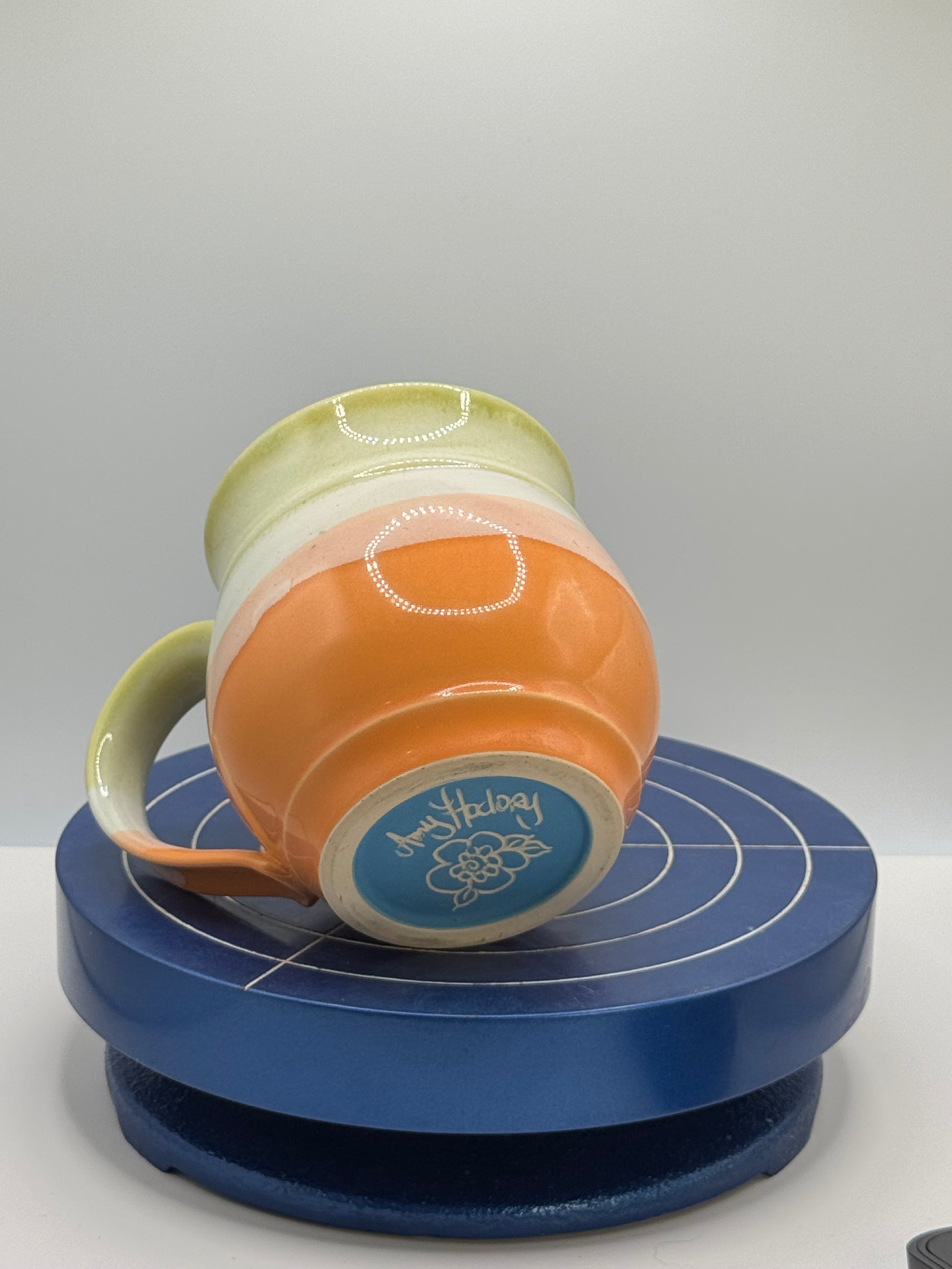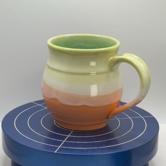 ~10.5oz handmade ceramic mug. Wheel-thrown stoneware with colorful orange, white, and yellowish glaze. Glossy finish. Dishwasher and microwave safe. Made for daily rituals, slow sips, and small moments that stay with you.